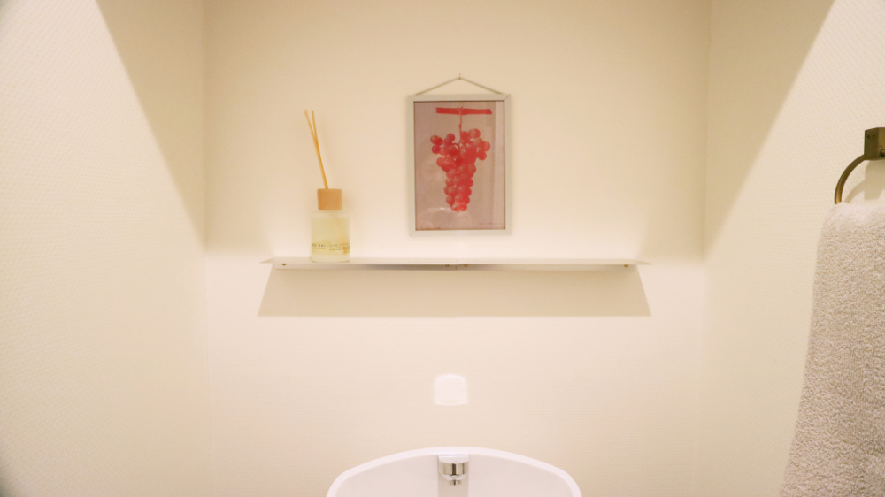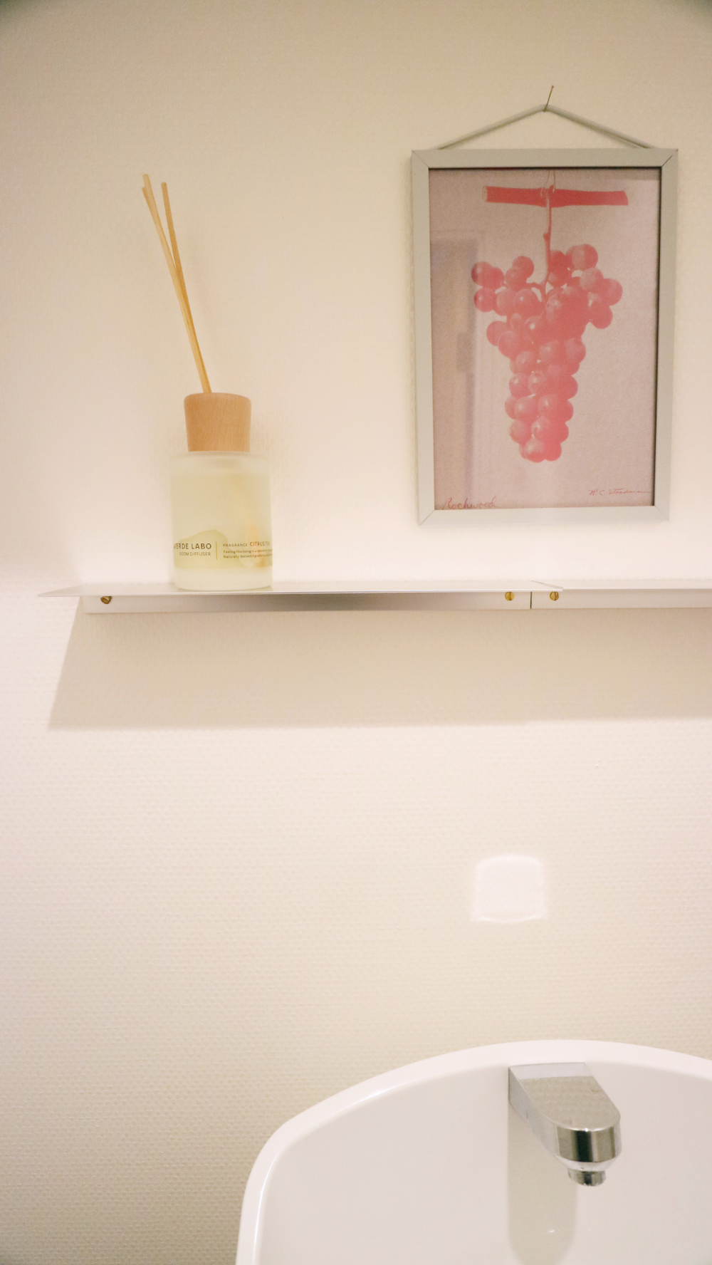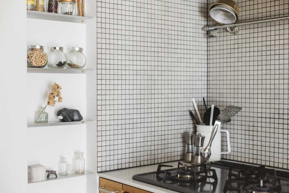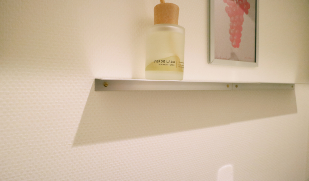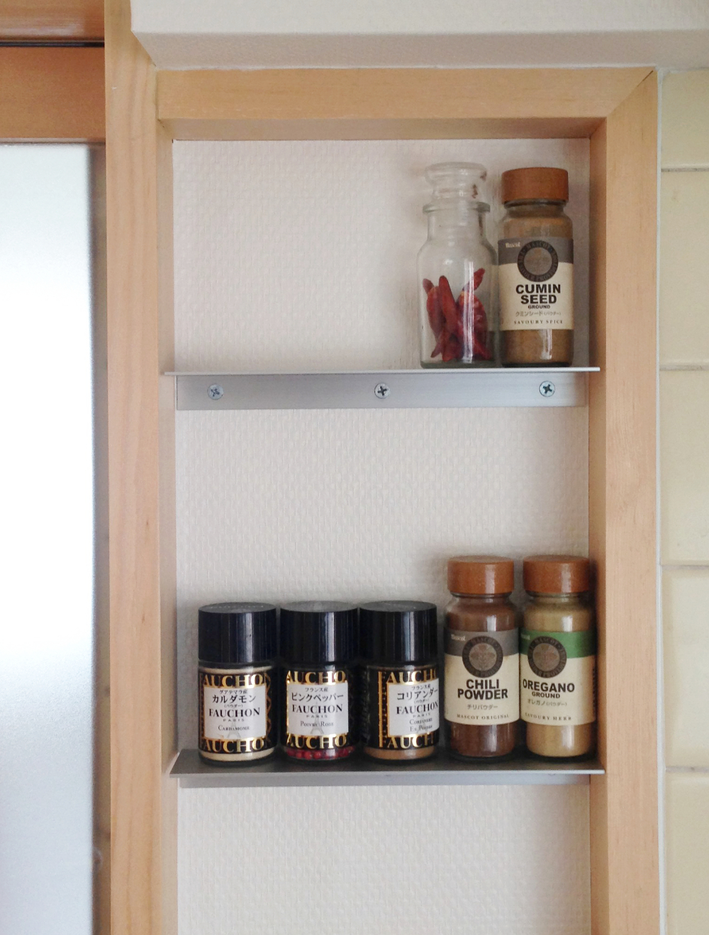 既製品のアルミアングルを真鍮ビスで取り付けた小さな棚です。シンプルで華奢なラインが空間を引き締めてくれます。小さな棚なのでスパイスラックとしたり、コスメを置いたりします。