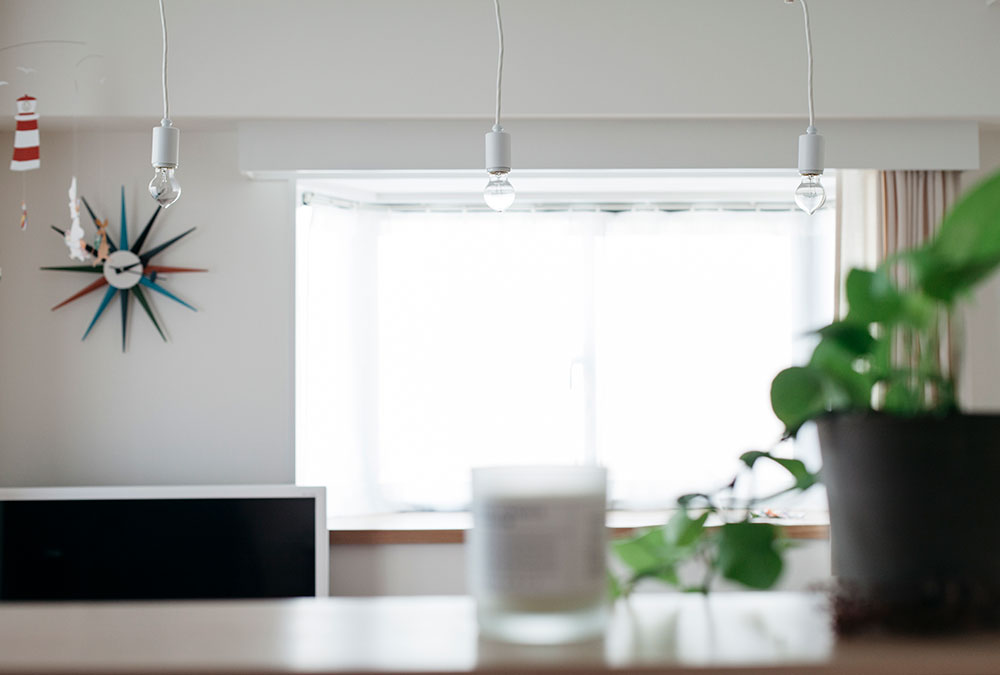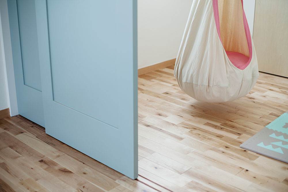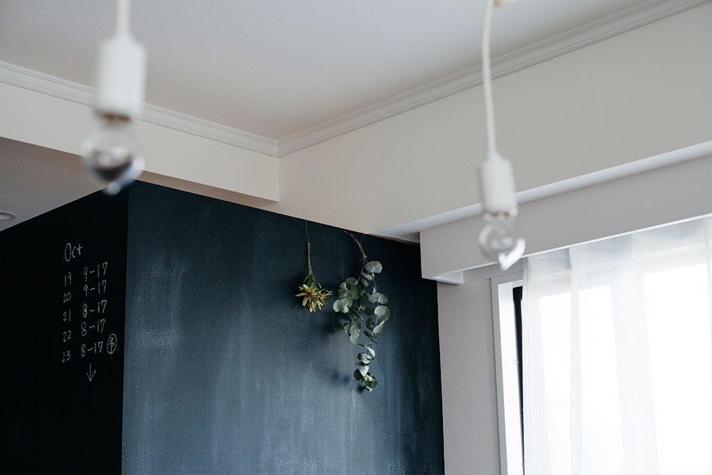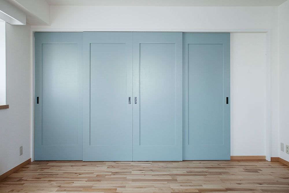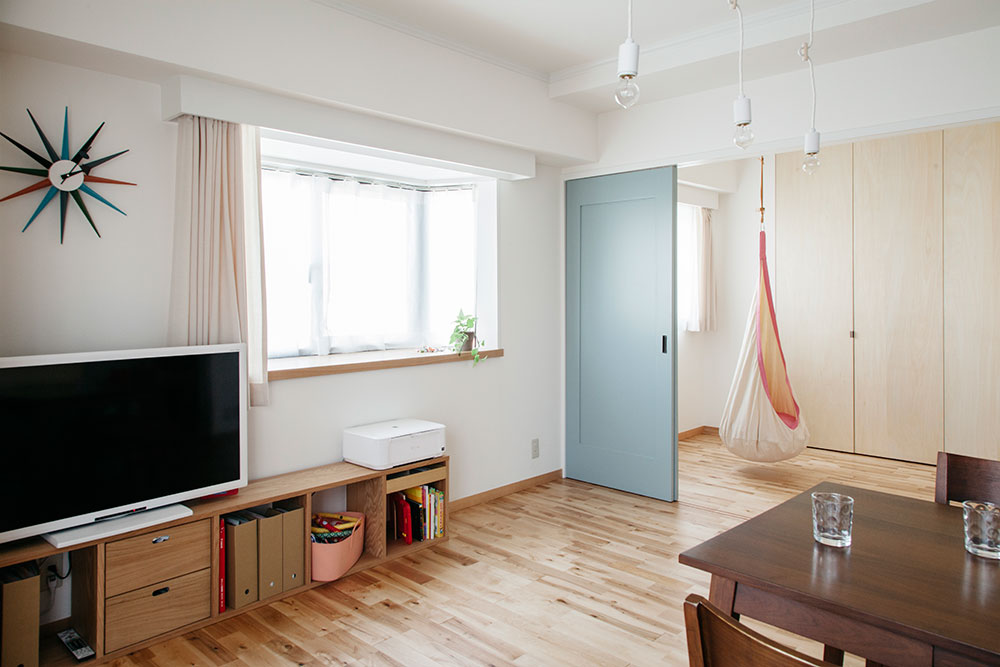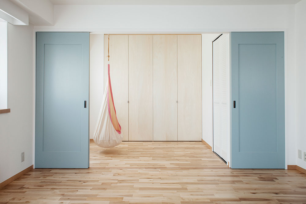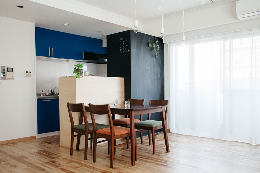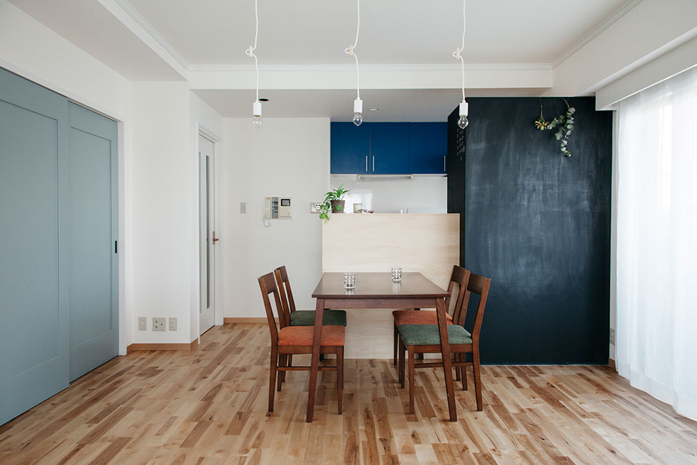 若い親子のための住まいです。 キッチンカウンターとトールキャビネットを設えて空間にリズムを付けました。トールキャビネットはマグネット塗料と黒板塗料を重ねて、プリントを貼ったりメッセージやメモ書きに使える便利なスペースに。 空間を仕切る4枚の引き戸は爽やかなブルーグレー色で塗装し、色の重なりを楽しめます。