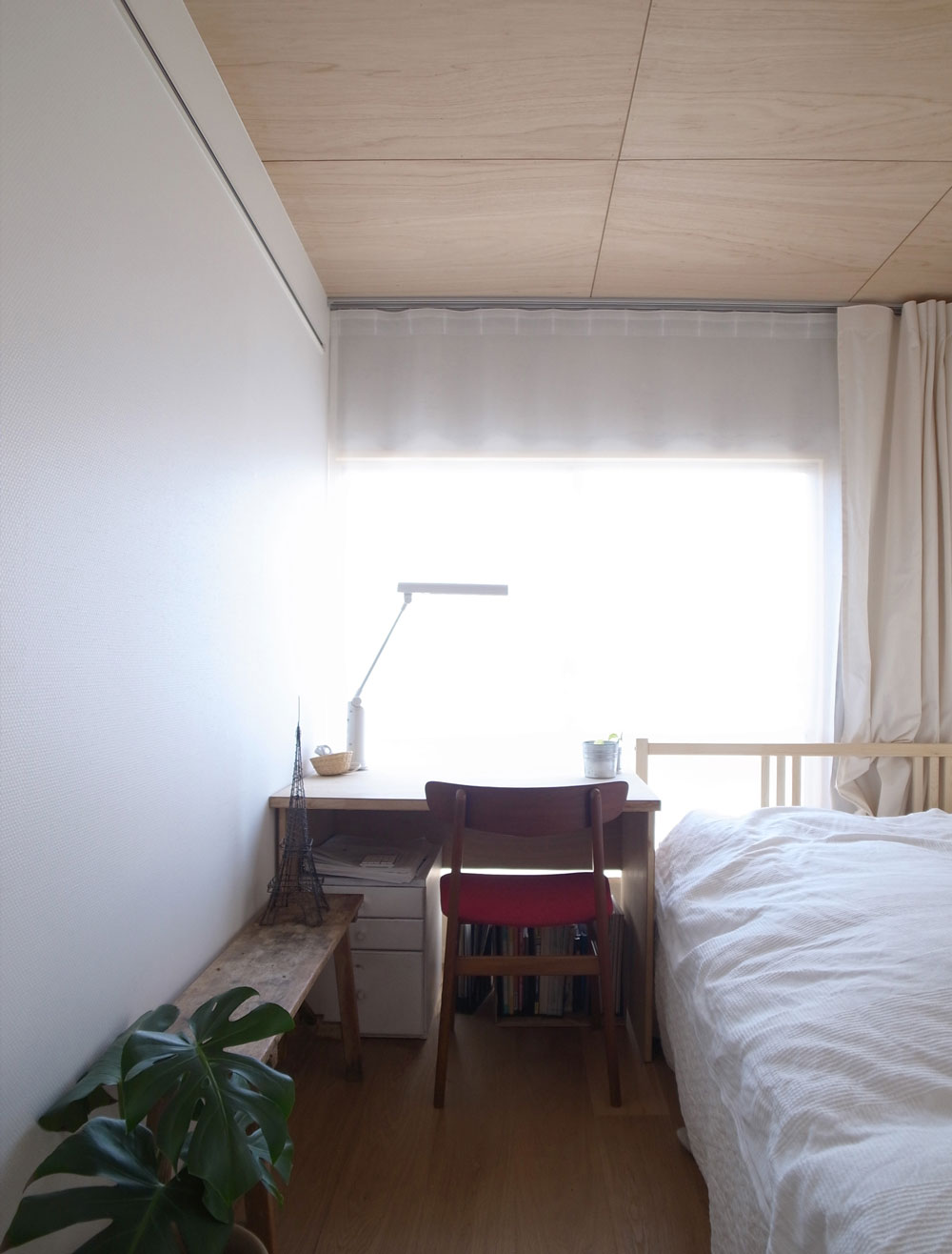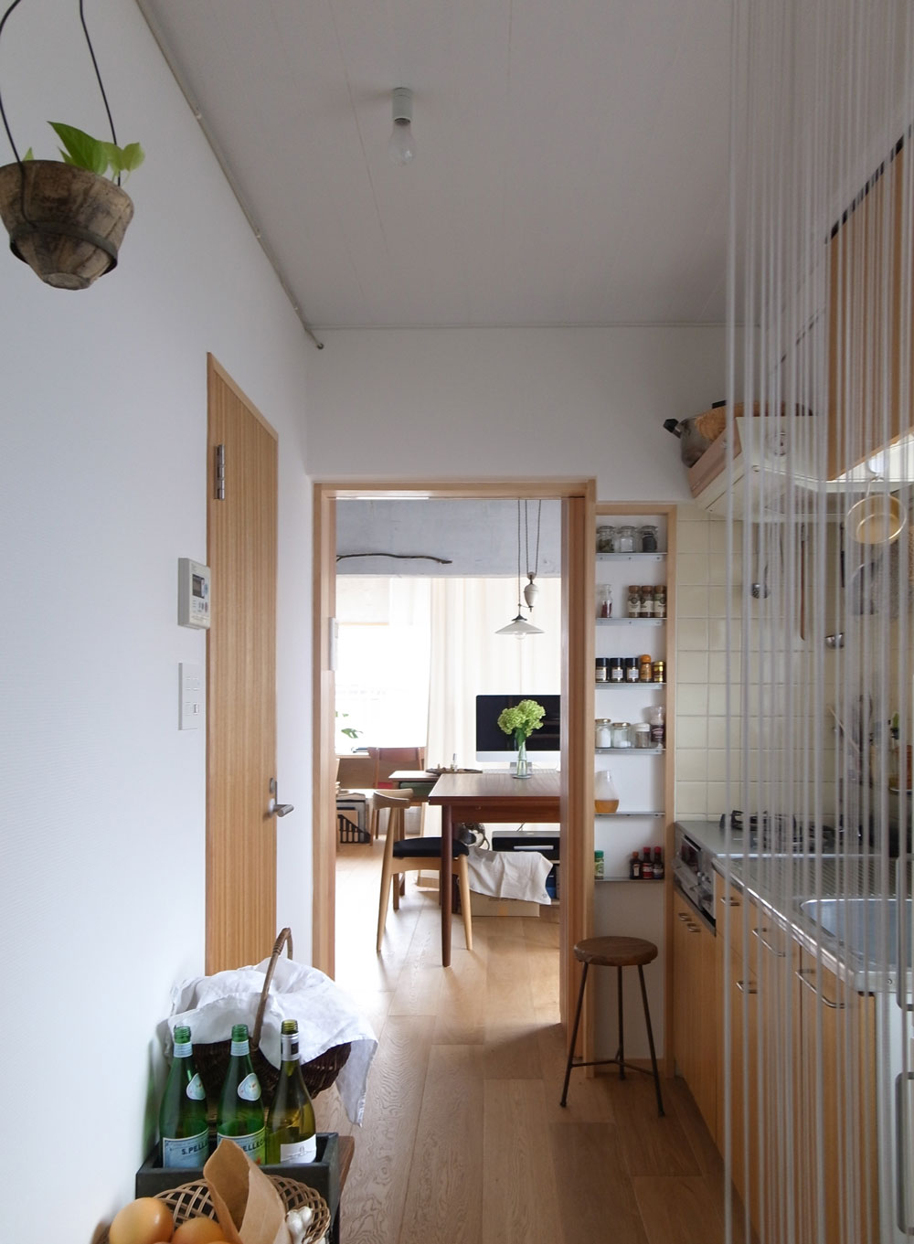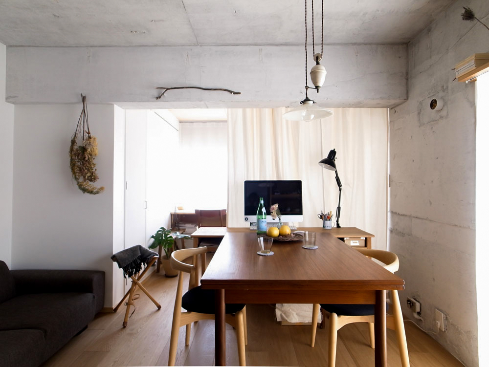 改装可能で賃貸されているマンションの改修です。 奥行きのあるプランを利用し、エントランスから寝室のプライベート空間までの間に、柔らかく透けるレイヤー(カーテンやガラス戸)を何層か入れることで、奥へと続く期待感が部屋を広く感じさせる仕組みになっています。 コンクリート部は塗料で薄く仕上げ、質感を残しつつ明るい空間となるようにしました。 現居住者が引越してからもこの部屋が引き継がれるべく、収納や設備を充実させて居住性を高めた上で、 次の居住者が手を加え更新される事を期待して、白い仕上げを基調としています。