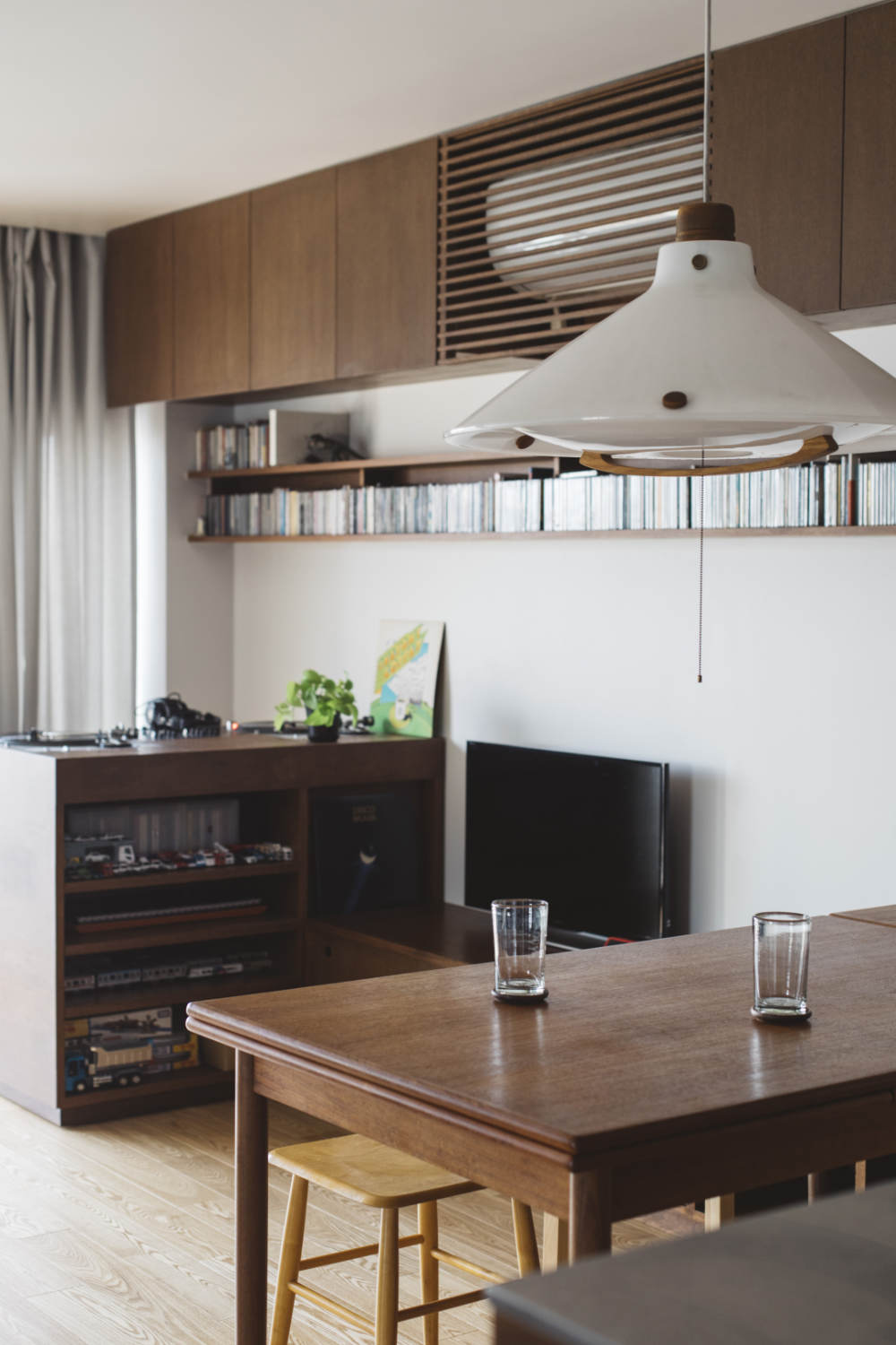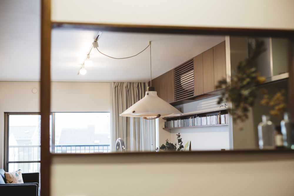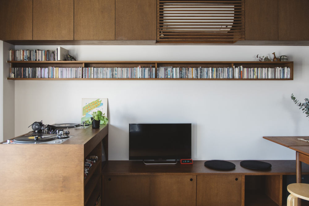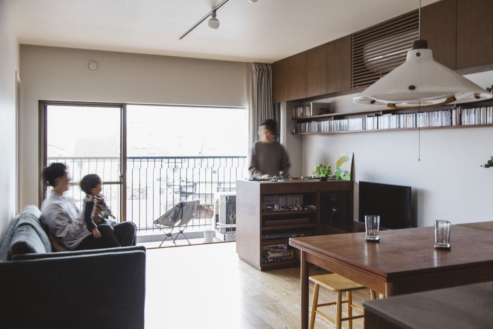 玄関とLDKの間に室内窓とガラス框戸を設え、玄関まで光りを届け、視覚的な広がりを感じられるようにしています。 奥行きの広いキッチンカウンターやベンチ棚、ご主人の趣味のために計画したDJカウンターなどは造作家具。DJカウンターはターンテーブルがすっぽりと入るようになっており、コード類も隠せるようになっています。キャスター付きのため、リビングに向けたり、壁に向けたり、他の部屋に運んだりすることができます。