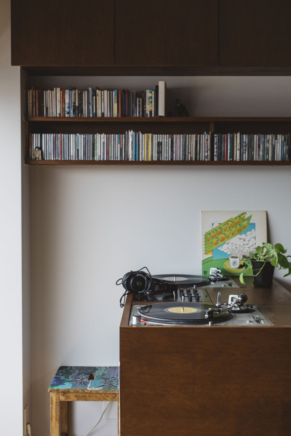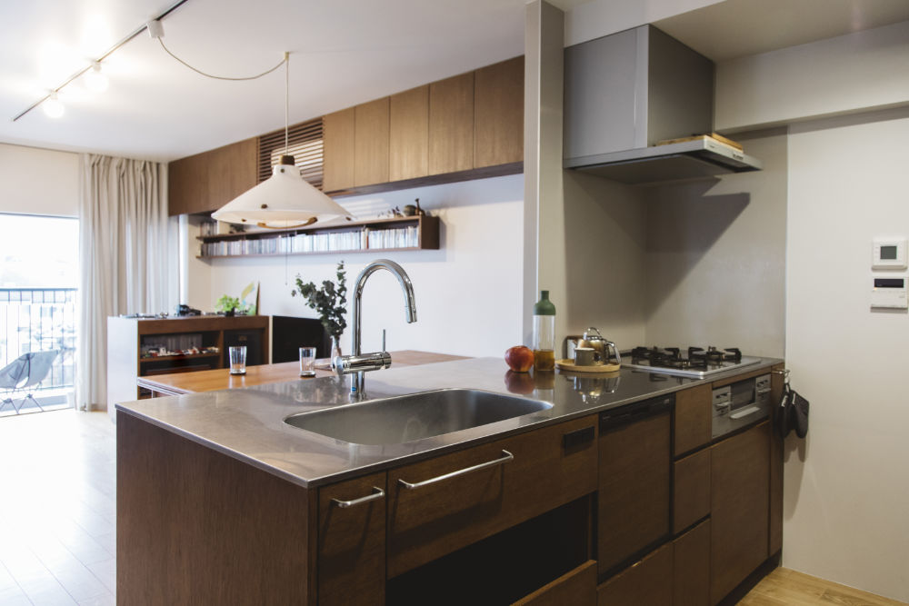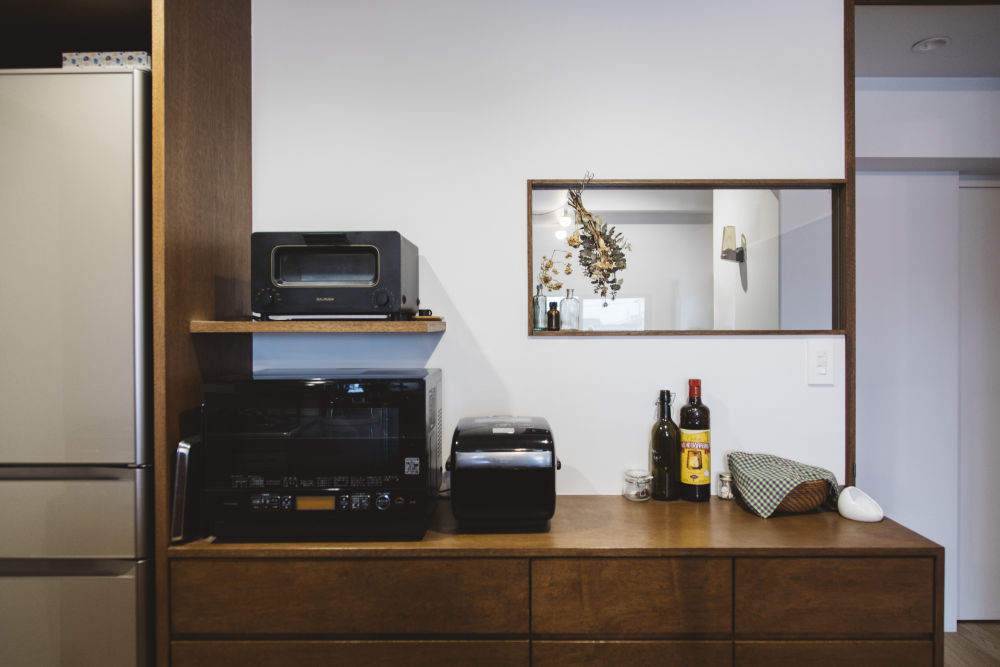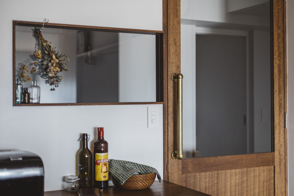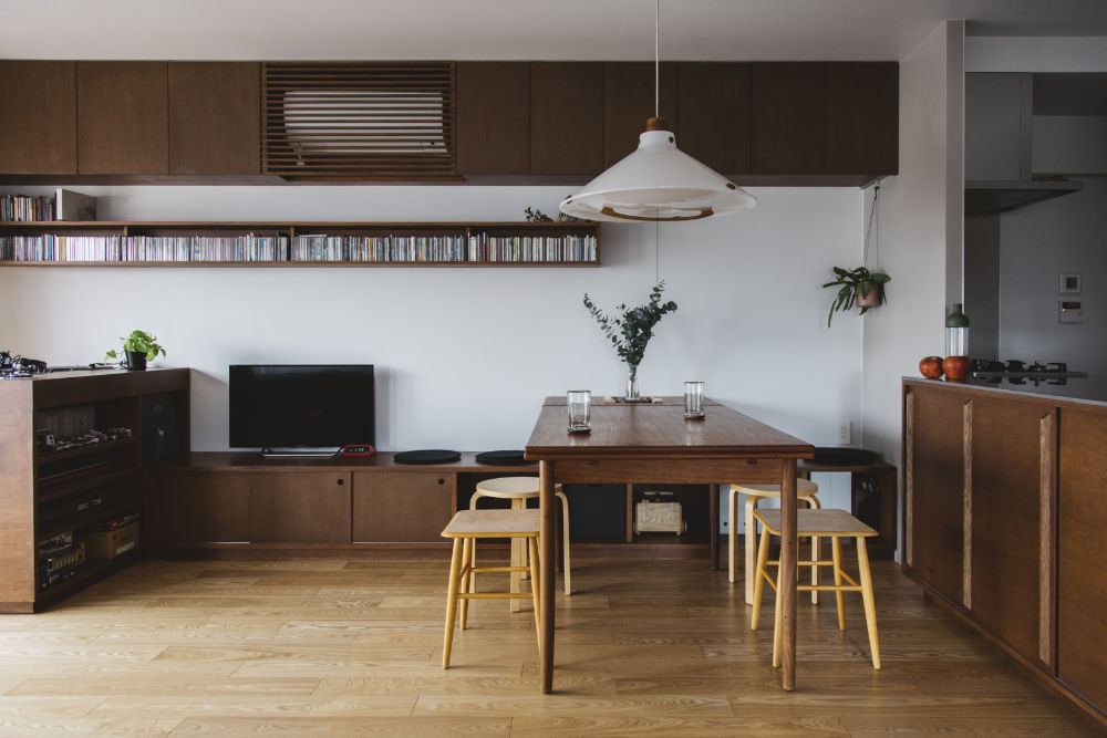 玄関とLDKの間に室内窓とガラス框戸を設え、玄関まで光りを届け、視覚的な広がりを感じられるようにしています。 奥行きの広いキッチンカウンターやベンチ棚、ご主人の趣味のために計画したDJカウンターなどは造作家具。DJカウンターはターンテーブルがすっぽりと入るようになっており、コード類も隠せるようになっています。キャスター付きのため、リビングに向けたり、壁に向けたり、他の部屋に運んだりすることができます。