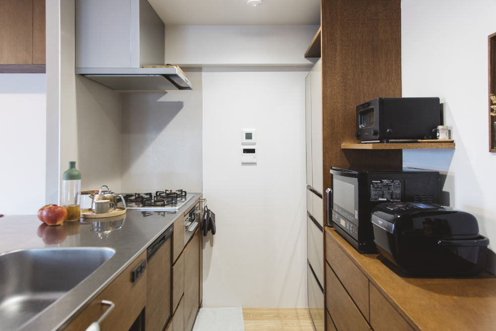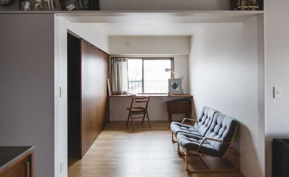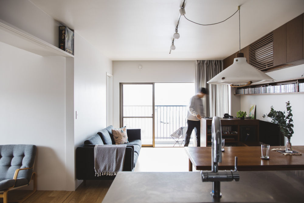 西荻窪に建つマンションのフルスケルトンリノベーション。 以前からこの地域に住んでいた若い家族が住み替えるにあたり、子供の成長や家族構成の変化に伴って変わっていくライフスタイルにどう対応していくかを、基本計画時に打合せを重ね空間構成をしました。 断熱材の施工とコンクリートブロックで間仕切られていた水回りの間取り変更を希望されていたため、フルスケルトンにして全体に断熱材を吹き付け、空間を再構築し、手持ちの家具に合わせて詳細寸法を決定していきました。