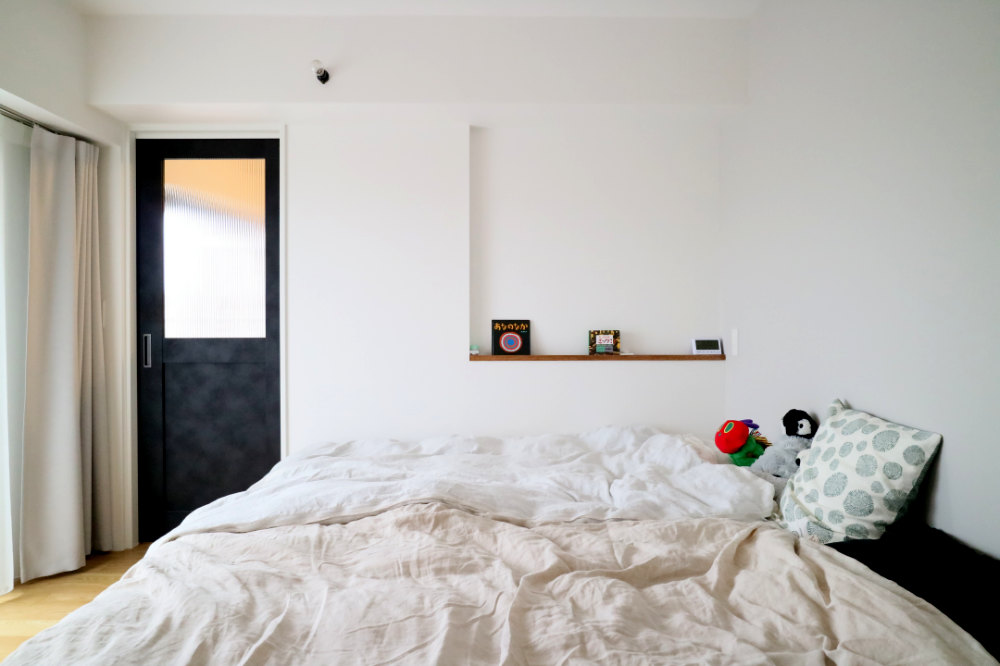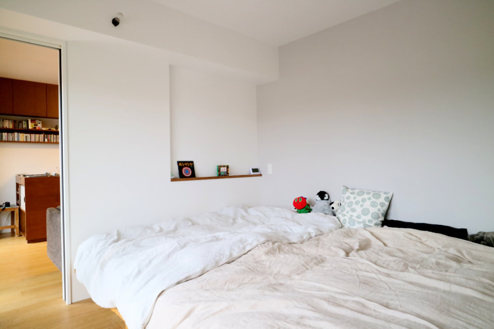 寝室には絵本などを立てかけられるニッチを。就寝時に光源が視界に入らないように、照明は枕元から離れた位置に壁付としました ※