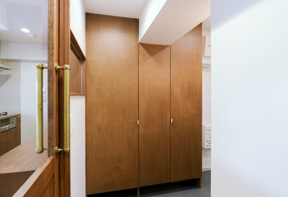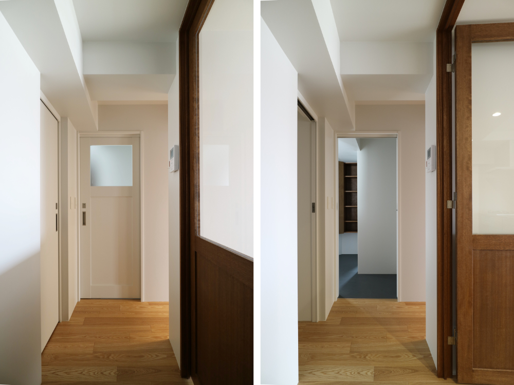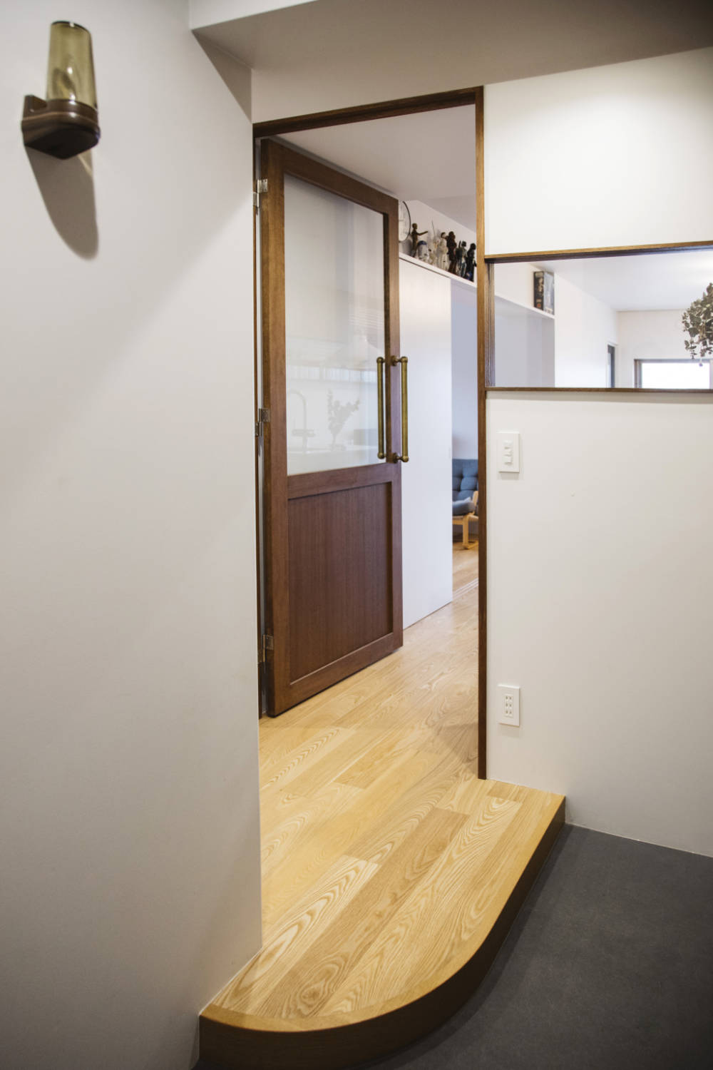 ガラス框戸と室内窓は玄関に光を届け、視覚的な広がりを感じられます。ドアの取手は上手工作所