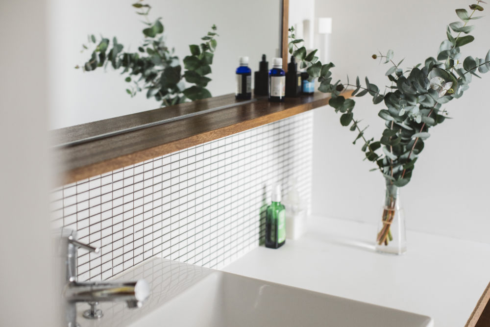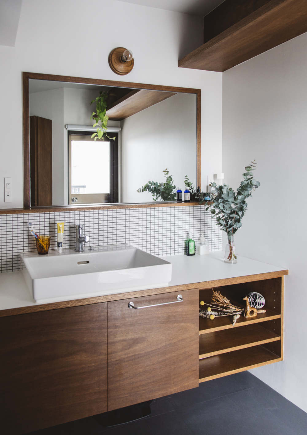 細かく間仕切られていて狭かった水回りは、位置を変えて広く計画。カウンタースペースを広くし、大きな鏡を設え、明るく爽やかな場所に変わっています。
