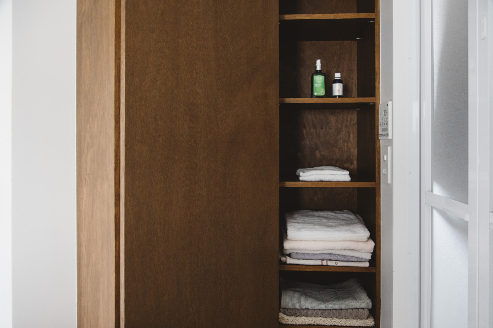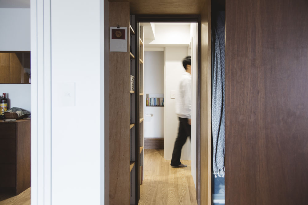 水回りのドアは開けたまま使いやすい引き戸。洗濯機などの生活家電は目に入らない位置に計画している