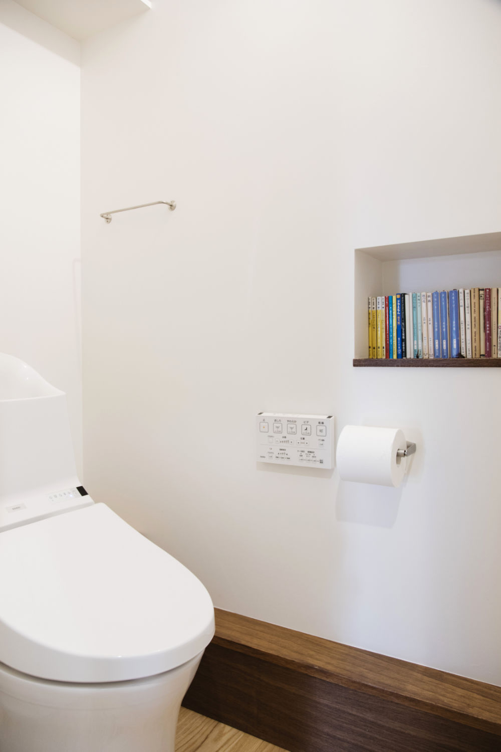トイレにはニッチを設けた。排水管は合板でカバーして塗装。万一の時もメンテナンスしやすいよう簡単にカバーしている