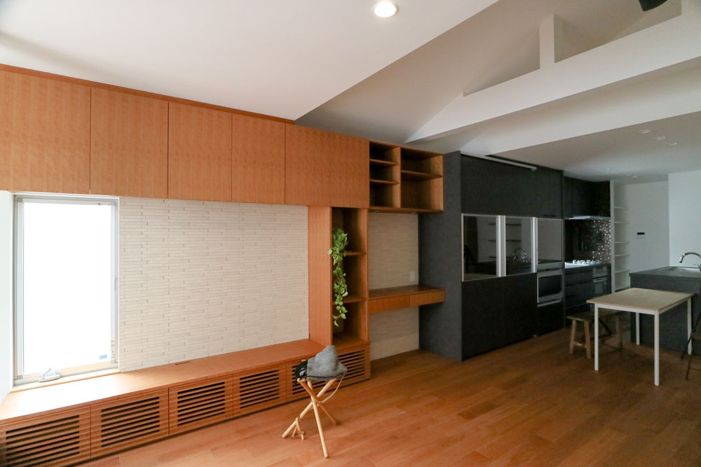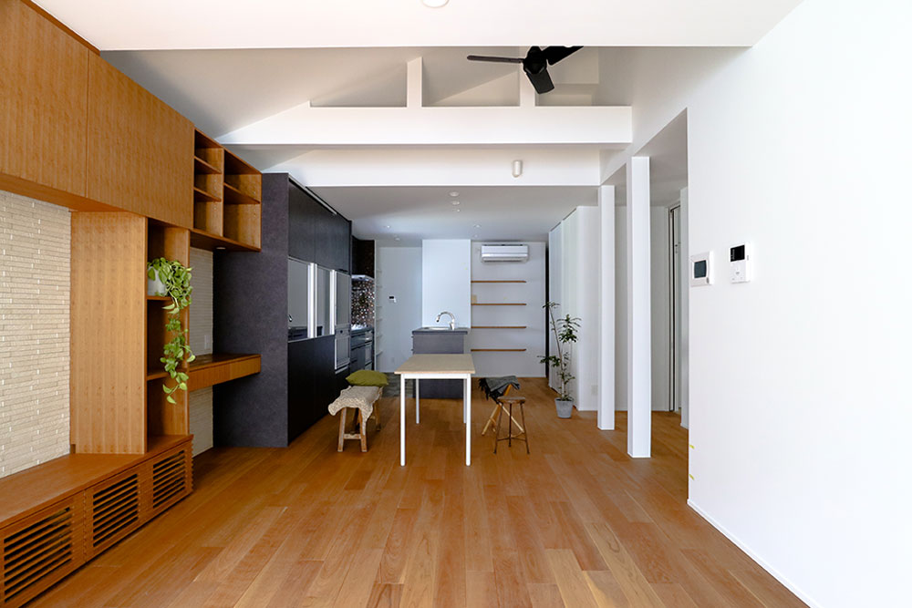 18畳のLDKは奥行きがあり、広さを感じます。一部天井を高くして空間に変化をつけています