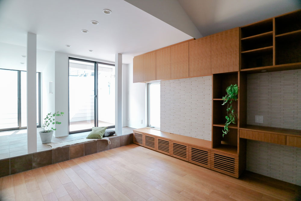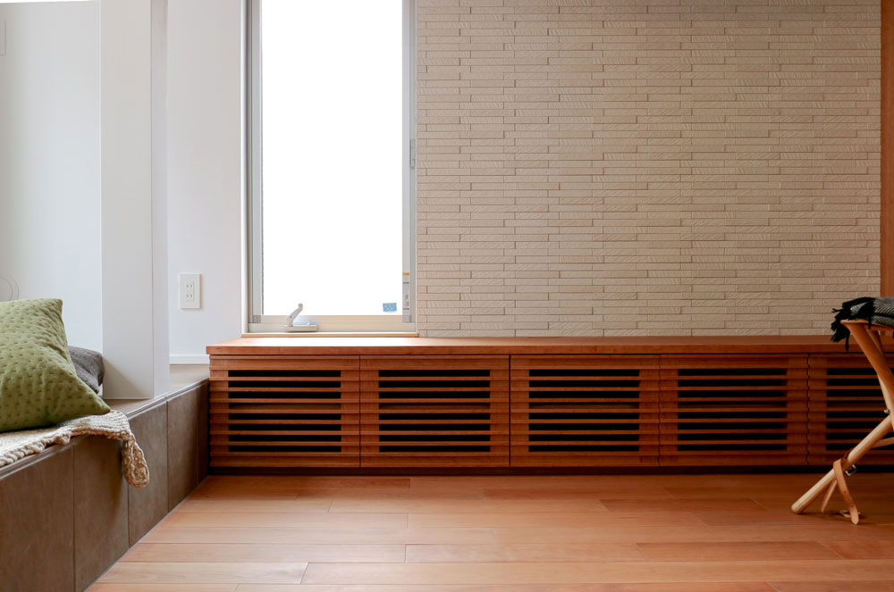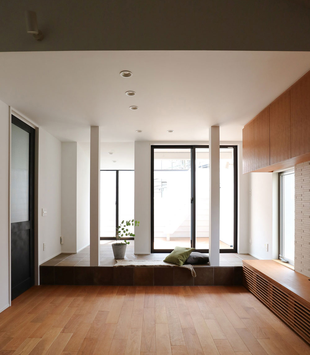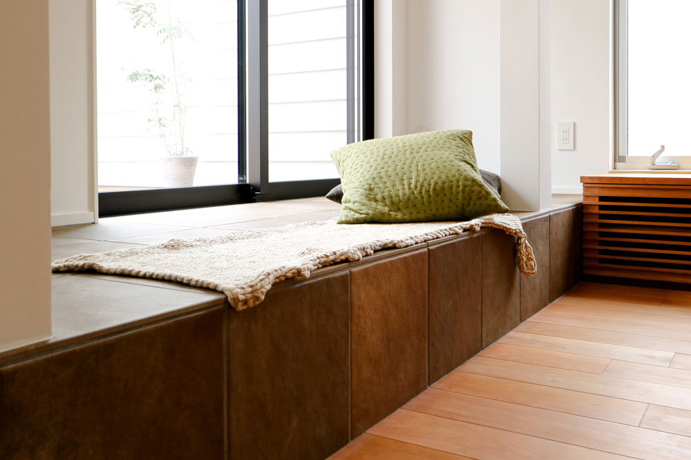 「室内の延長のような屋外空間を」とのご要望があったため、2階にリビングとつながるテラスを新たに造りました。テラスの手前で小上がりをつけることで空間に変化が生まれ、そこに腰掛けたり、或いは小さな舞台となったり、多彩な生活が展開される場となります。