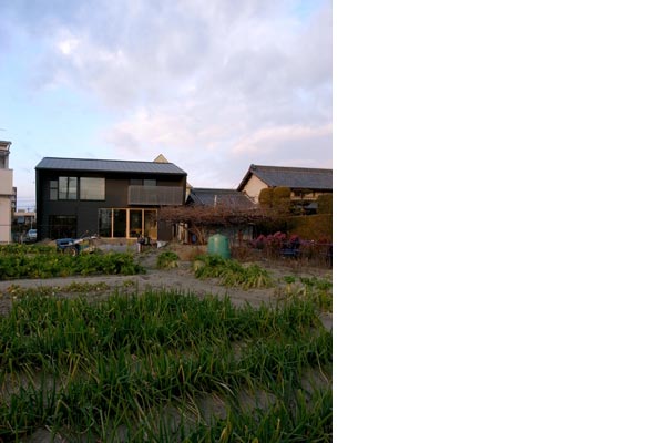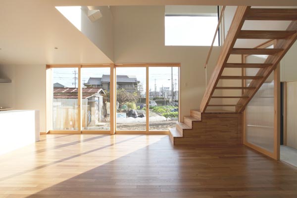 通り抜け土間をもつこの住宅は、土間とリビングのそれぞれに吹き抜けがあり、さまざまな方向に視線や風が抜けます。屋根・外壁は黒いガルバリウム鋼板葺き。切妻の屋根をもつこの住宅は、地域の民家の景観と呼応する住まいとなっています。